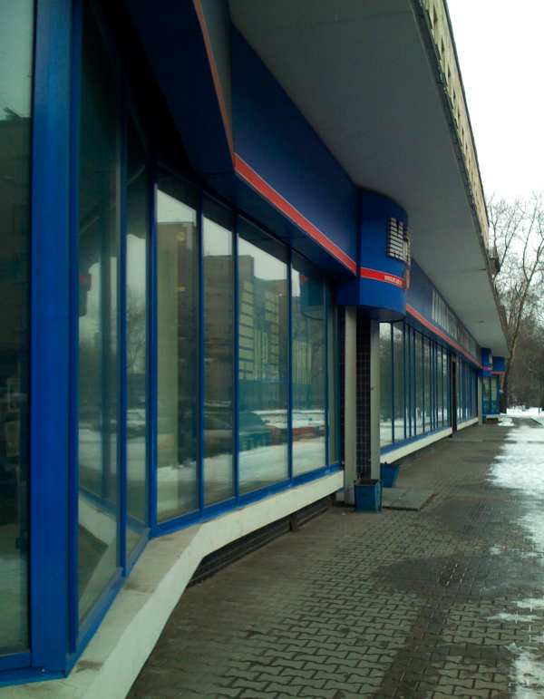 Особенность: большие витрины площадью приблизительно 9 кв.м (AGS 150), стеклопакеты > 220 кг из двух 6 мм стекол с защитой по классу А2. Две витрины - арочные, приблизительно 6 кв.м из ПВХ профиля.